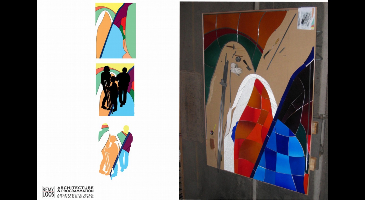 Pensé comme une porte reliant les disparus aux vivants, l’ouvrage utilise la lumière en la filtrant, dans un ensemble constitué d’un vitrail en verre de Saint-Just, d’un verre trempé et d’un verre dépoli.